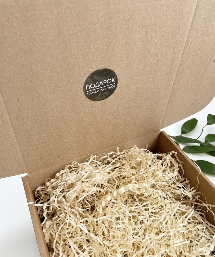 В набор входит: коробка крафт, размер 20х20х10 см, наполнитель, лента, набор наклеек 6 шт.