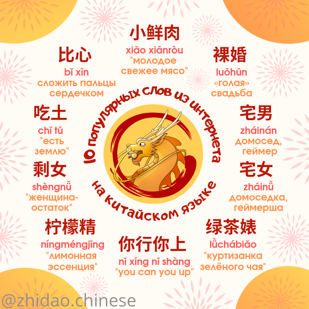 #zhidao_способы_сказать ? Сегодня предлагаем вам 10 популярных сленговых слов из китайского интернета! 💻 1️⃣ 小鲜肉 xiǎo xiānròu - дословно "молодое свежее мясо" - красивый молодой актер, кумир молодежи 2️⃣ 裸婚 luǒhūn - «голая» свадьба - без покупки квартиры, автомобиля, свадебной церемонии, колец и т.п. 3️⃣ 宅男 zháinán - домосед, "домашний мальчик", геймер 4️⃣ 宅女 zháinǚ - домоседка, заядлая геймерша 5️⃣ 绿茶婊 lǜchábiǎo - "куртизанка зелёного чая" - девушка, которая притворяется милой и наивной, скрывая свою холодную и расчётливую натуру ❗С этим словом нужно быть осторожнее, так как оно довольно грубое 6️⃣ 你行你上 nǐ xíng nǐ shàng - калька с английского "you can you up" - "если думаешь, что способен [на это], тогда вперёд!" 7️⃣ 柠檬精 níngméngjīng - "лимонная эссенция" - человек, который критикует окружающих из зависти 8️⃣ 剩女 shèngnǚ - "женщина-остаток" - засидевшаяся "в девках" женщина (как правило, от 28 лет) 9️⃣ 吃土 chī tǔ - "есть землю" - жить очень бедно, когда нечего есть (из-за и