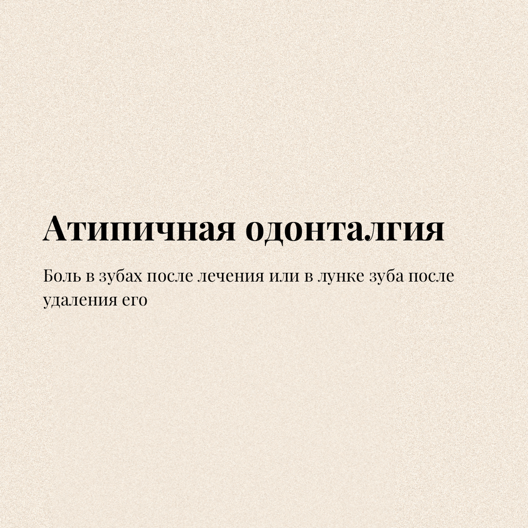 Атипичная одонталгия - продолжительная боль в зубах или лунке зуба, возникает после удаления зуба или лечения каналов при отсутствии какой-либо объективной патологии со стороны зубов. Обычно диагноз является диагнозом исключения. В литературе также описывается как фантомная зубная боль. Боль постоянная, тупая, глубокая, жгучая, стреляющая, может быть пульсирующей. Сразу после пробуждения боль может кратковременно отсутствовать. Локальное воздействие на зуб (холод , горячее) не приводит к боли. Боль не нарушает сон. Боль может быть в течение нескольких месяцев после эндодонтического лечения, или даже возникать через несколько месяцев после него. На коже лица и в полости рта вокруг зоны боли развивается гипералгезия (участков повышенного восприятия боли). Потеря молочных зубов не приводит к подобной симптоматики, это касается только постоянных зубов. (Слово «коренные» относится ко всем видам зубов, ибо все зубы имеют корни) Критерии: 1. Постоянная интенсивная боль как минимум 8