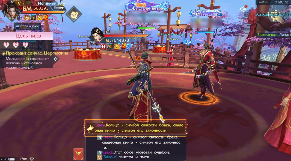 Пятиминутная свадебная церемония с восточным колоритом и небольшими приятными бонусами. В конце церемонии вы получаете временный облик «Три жизни» и подарок «Доброго знамения», в котором содержится ящик с картой сокровищ (4 ур.) 1 шт., саше (2 ур.) 1 шт., Начало любви 3 шт.