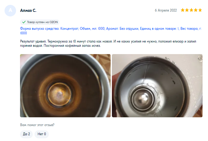 Наша семья обожает вылазки в парк с термосом ароматного чая и бутербродами. С утра я варю кофе, но часто не успеваю его выпить и поэтому еду на работу с термокружкой, чтобы выпить кофе по пути. К чему это я? Со временем термосы и термокружки внутри покрываются налетом. Этот налет от чая или кофе сложно отмыть – руки не достают до дна, в термокружку и вовсе не пролазят. А еще столкнулись с тем, что раз заварили в термос кофе после травяного чая и, ну, вы сами понимаете, кофе был безнадежно испорчен ароматами трав. Казалось бы не такая серьезная проблема, чтобы очень уж переживать, но неприятненько. И тут я наталкиваюсь на отзыв на Озоне, что мой любимый кислородный пятновыводитель Елизар решает и эту проблему! Как так, всего 10 минут? Да, верю! Ведь кипяток и чистящее средство Елизар – команда мечты. Вместе они побеждают и уничтожают любой застарелый жир и пищевой налет, избавляют от запахов, выводят застарелые пятна с ткани. Главное, делать процедуры нужно в тазу или мойке, чтобы раств