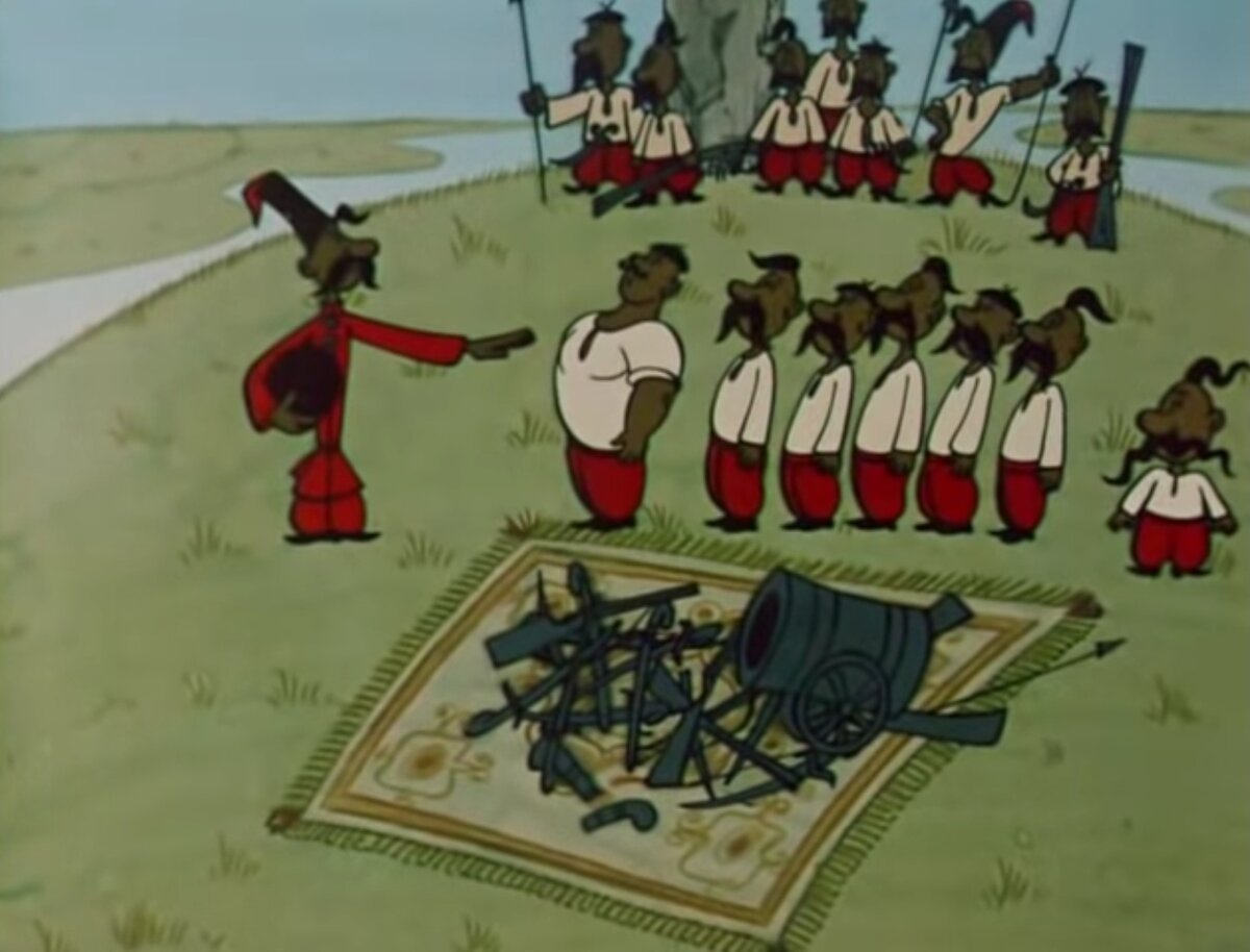 За неимением тренера, роль лидера, капитана и знатока тактики взял на себя атаман Грай. На яблоках худощавый казак объяснил своей команде азы футбола и выбрал схему расстановки 2-4-1. Основной состав запорожской команды насчитывал 8 человек. В воротах место занял сам атаман. Защитную линию составил гигантский Тур и еще один безымянный казак. В центре поля расположились три небольших казачка, а завершителем атак выступил миниатюрный Око, на тренировках показавший идеальное голевое чутье.
