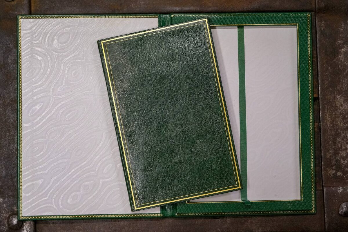 А. С. Пушкин “Кавказский пленник” 1828 год. Вот бывает смотришь на книгу и даже не догадываешься о ее настоящей ценности в мире букинистики! Она может быть невзрачной на вид, в ней мы не найдем иллюстраций известных художников… Но стоит открыть ее и тут же все становится на свои места! Так было и с сегодняшним гостем нашей мастерской. В работу поступило второе прижизненное издание известной поэмы А. С. Пушкина. К слову, в тираж вышло всего 1000 экземпляров и сейчас каждый из них на вес золота! А если учесть, что книга прошла через века и сохранила шикарный подносной переплет, то ценность издания становится фантастической. На этот раз нам предстояла работа по обеспечению сохранности столь редкого экземпляра. Было принято решение изготовить футляр, близкий по стилистике к переплету. Для этого мы использовали кожу изумрудного цвета, на которой оттеснили рельеф в виде мелкого ромба. Добавили тиснение на сторонке и корешке. Внутри футляр отделан старой мраморной бумагой, что является большо