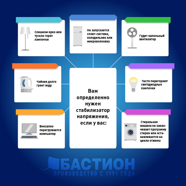 - Купить стабилизатор непроверенного бренда. Такие приборы часто сгорают. В свою очередь, все мощные стабилизаторы завода «Бастион» имеют трехуровневую защиту от перегрева и перегрузок.