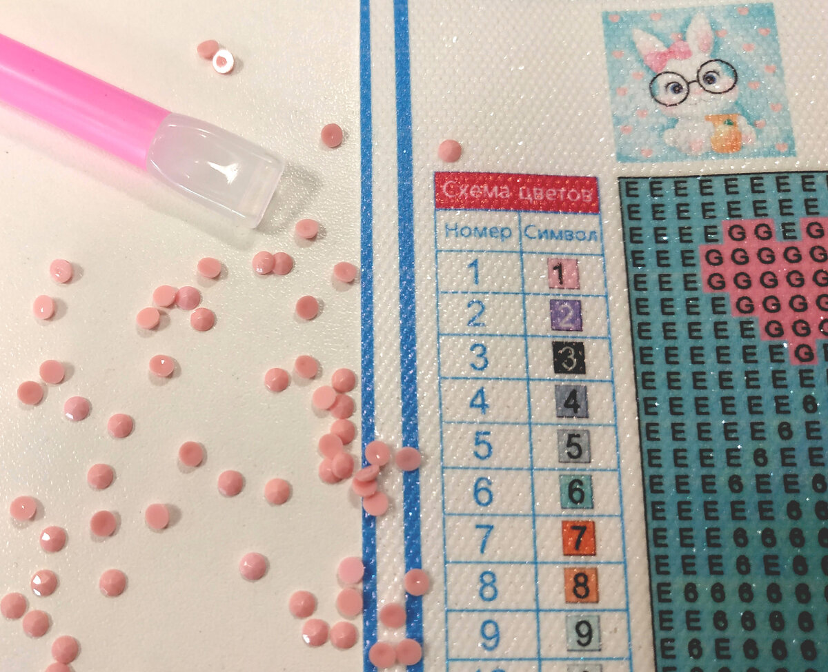 Если вы только собираетесь вступить в клуб любителей алмазной мозаики, эта статья однозначно поможет вам освоить это увлекательное занятие! В ней мы пошагово рассказали и показали все правила и нюансы по сборке картинки из страз. Вам осталось лишь следовать нашей инструкции и получать удовольствие от процесса! Начать нужно с подготовки удобного рабочего места, где вы будете выкладывать вашу мозаику. Лучше всего это делать на столе. Только не на кухонном! Желательно, чтобы это был отдельный стол, где вам никто не помешает, а крошки от хлеба не заменят стразы на картинке. Также стоит позаботиться о хорошем освещении. Так вы не будете напрягать глаза и не перепутаете оттенки страз. Картинка-основа представляют собой схему с различными цифрами, буквами и символами. Каждый из них соответствует определенному цвету. Чтобы понять, какой цвет кристалла вам нужно взять, внимательно изучите схему, которая размещена на боковой части холста. На каждом пакетике со стразами также указан номер цвета.
