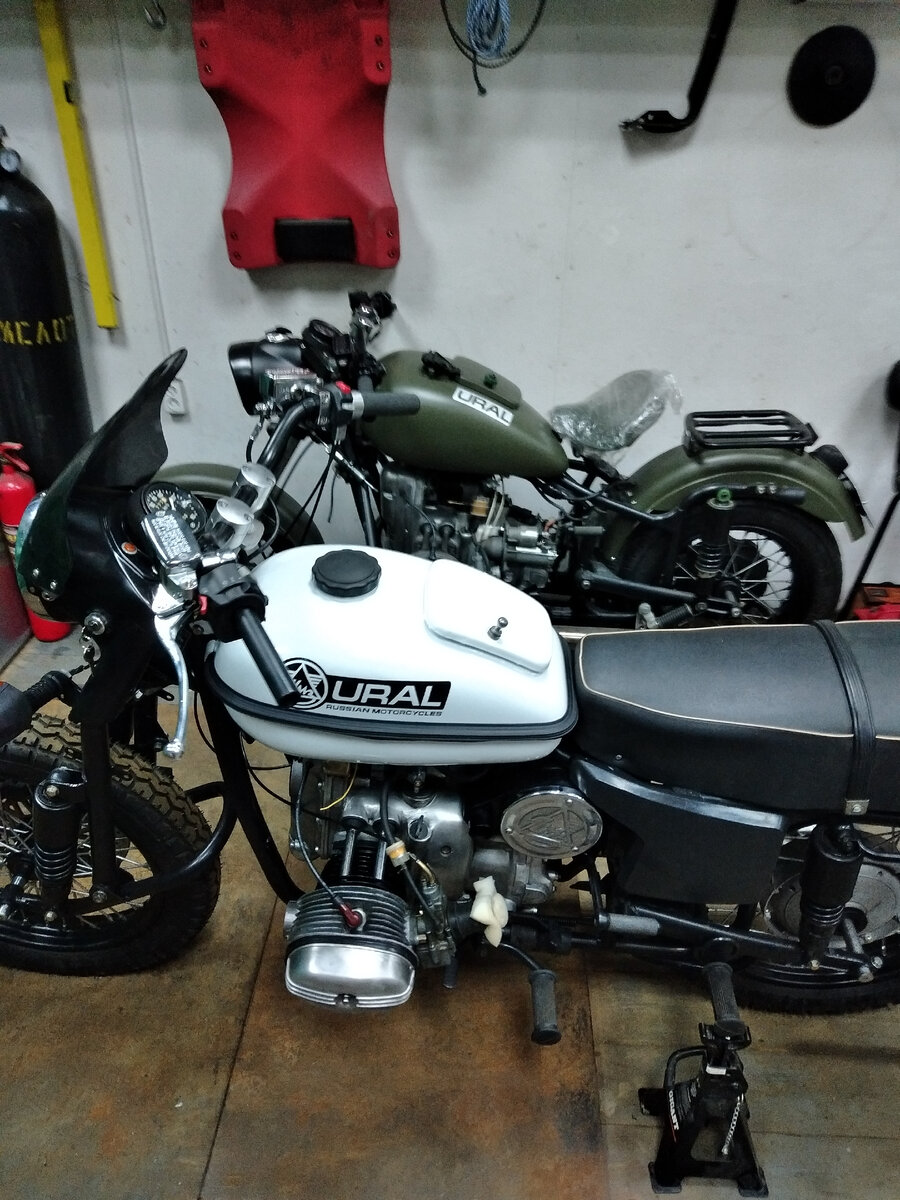 ... Продолжение. Получив "кузовные" элементы из покраски, я начал окончательную сборку мотоцикла. Несмотря на то, что основная концепция - заводской вид, множество компонентов не имеет ничего общего со стандартными деталями ИМЗ. Я ставил перед собой задачу получить надежный, "осовремененный" мотоцикл. Итак, основной цвет мотоцикла - белый. Кронштейн запасного колеса, петли багажника коляски и прочая мелочевка - выкрашены порошком. Коляска собралась без проблем - все резинки, втулки - новые, в маятнике - полиуретан, амортизатор - с картриджем из Фиатовского амортизатора. Ветровое стекло на коляске сразу устанавливать не стал, как и боковые ящики - сначала нужно было поставить мотоцикл на учет, ведь покупался он в виде рамы и картера с документами. Далее настал черед непорсредственно мотоцикла. Двигатель уже был подготовлен, накинул заднее крыло и приступил к электрике. Как и в случае со своим М-63, о котором писал ранее, вся проводка создана заново, от стандартной ни одного проводка