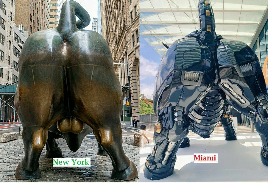 P.S. На контрасте с Нью-Йоркским сородичем выглядит прикольно, даже лазерные глаза добавили, главную фишечку биткоина, одной детали только не хватает, как у оригинального быка 😄