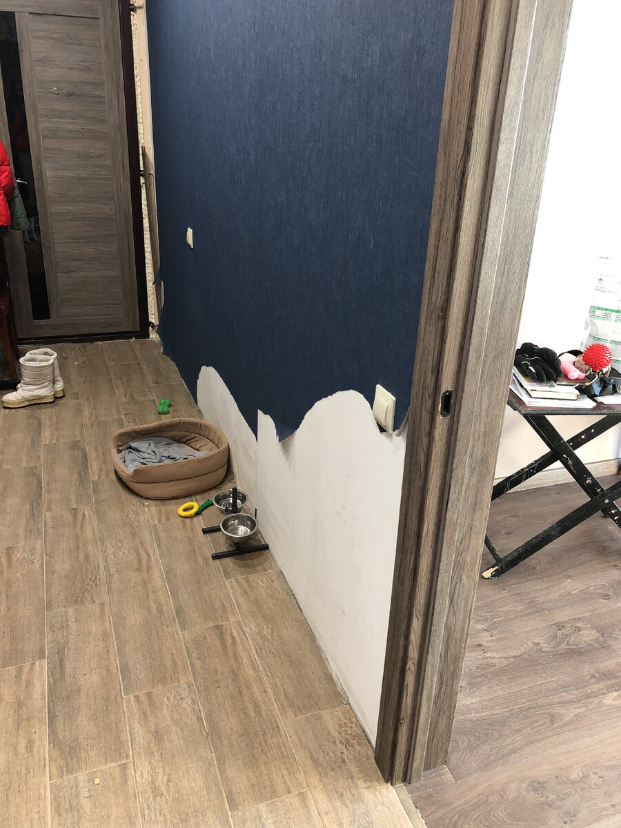 Затем мы обратились к кинологу (про это будет отдельная история), Который нам посоветовал ограничить его отдельной комнатой или клеткой. Мы решили, что клетка - это немного жестоко и стали оставлять его в коридоре. С новеньким ремонтом. За совсем короткое время наш новенький ремонт и часть старого превратились в это: