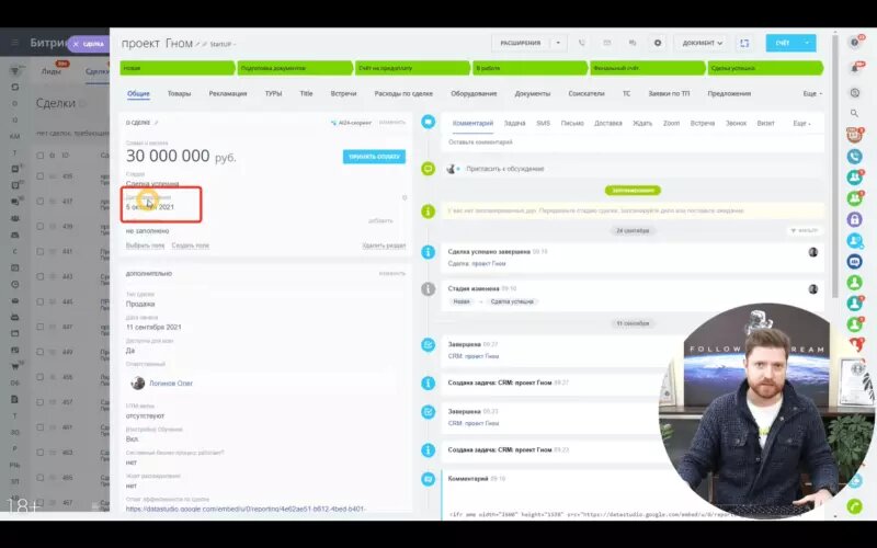 В качестве примера рассмотрим работу с основной рабочей сущности CRM – сделки. Сотрудники компании принимают заказы, сопровождают клиентов по всем стадиям подводя сделки к своему логическому завершению – оказание качественной услуги клиенту и получения соответствующего денежного эквивалента за оказанную услугу.