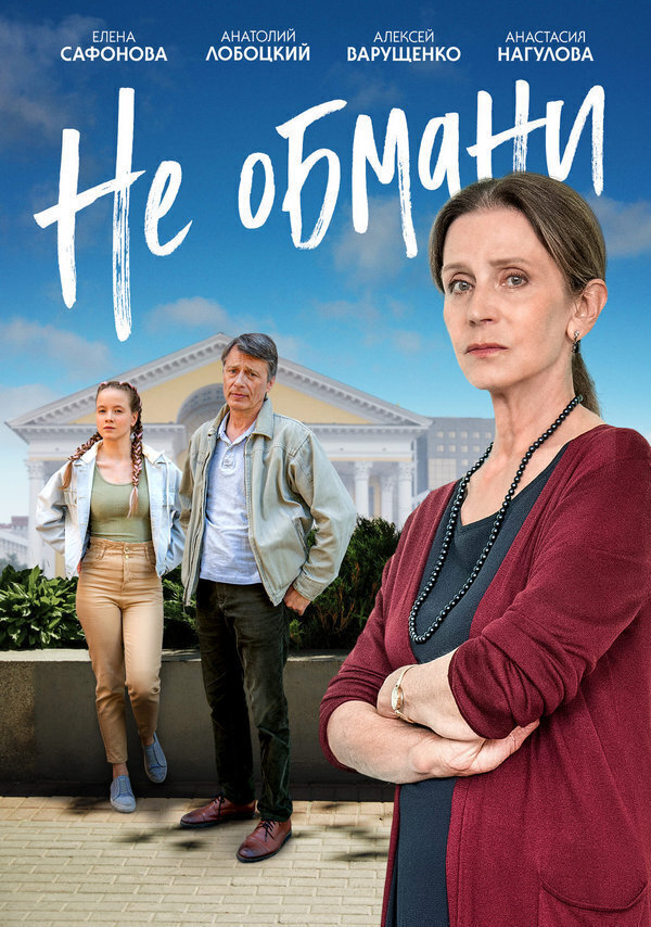 ИНФОРМАЦИЯ О ФИЛЬМЕ: Название : НЕ ОБМАНИ (2022) Режиссер Алексей Праздников Сценарист Виктория Евсеева Оператор Степан Коваленко Композитор Леонид Иновлоцкий Художник Ассоль Гизатуллина Продюсеры Вячеслав Михайлов (ген.), Андрей Савенко (иcп.) Кастинг-директор Наталья Николаева (IV) Актеры Елена Сафонова, Анатолий Лобоцкий, Анастасия Нагулова, Алексей Варущенко, Марина Денисова, Максим Митяшин, Илона Гайшун, Артём Лопатинский, Татьяна Калачева, Ольга Лопухова, Ринат Имаев, Кристина Морозова Производство Энерджи Фильм Премьера 6 января 2022 (ТВЦ) Cерий 2 Жанр мелодрама, детектив Описание : В результате ДТП у Людмилы погибает сын Владимир. Перед смертью он говорит ей, что у него есть внебрачная дочь. Он хочет оставить всё свое имущество ей. У умирающего всегда были сложные, конфликтные отношения с матерью. Он сомневается, что она исполнит его просьбу, и умоляет: «Не обмани...» Людмила начинает поиски бывшей девушки сына и своей внучки, а за это время, встречая разных людей из окр