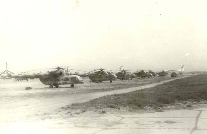 Уже немного рассвело, впереди светлая полоска неба на фоне еще темных гор. Включаю форсаж, толчок вперед, начинаю разбег. Полоса впереди скрыта пылью, поднятой от Ан-12. Высота аэродрома 1450 м, поэтому длина разбега раза в два больше, чем на равнине. Проскакиваем облако пыли, самолет поднимает нос, бежим дальше. Впереди еще одно облако пыли от вертушек. Скорость около 350, видимость сносная - метров 400-600. Вдруг впереди на полосе в пыли появляются очертания вертолетаМи-8! До него метров 300. Отвернуть уже не удастся, беру полностью ручку на себя, самолет неохотно задирает нос, ПВД выше гор, время растягивается в бесконечность, отрываемся. проскакиваем в метре от несущего винта. Чтобы не свалиться, чуть отдаю ручку, снова стукаемся на полосу, несколько секунд разбега, и, наконец, в воздухе! Убираю шасси, закрылки, от горла отошло, говорю РП, что о нем думаю, и сообщаю, что какой-то «дятел» без разрешения вылез на полосу.