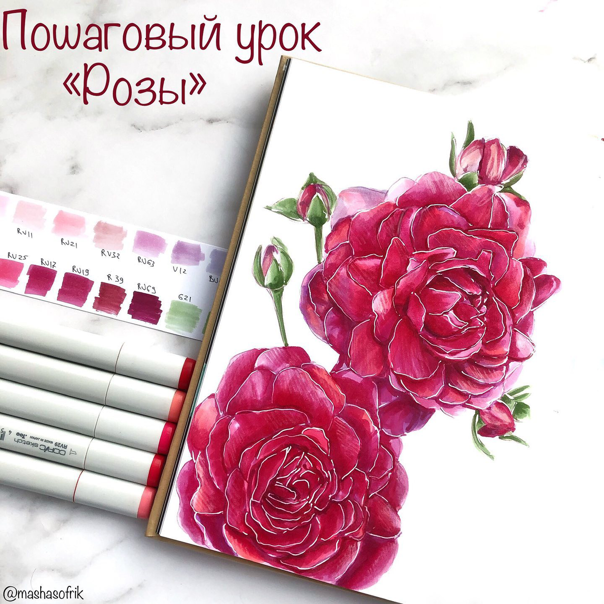 Раз уж у меня период цветов, то вот и один из моих вариантов уроков для вас 🤍 ⠀ 1. Делаю карандашное построение. Ни в коем случае не высчитываю точное количество лепестков - если нужно, то добавляю или убираю некоторые из них. Смотрите по композиции, главное, чтобы они в бутон заворачивались ⠀ 2. Для начала светлые оттенки: RV10, RV11, RV21, RV63. В ботанике я использую много похожих оттенков, потому что так она смотрится интереснее. На каких-то лепестках один розовый, на каких-то другой, а на каких-то их смешение ⠀ 3. Добавляю яркие оттенки: V04, V06, V12, BV00. На первый взгляд может показаться, что они не подходят, но в конечном счете они будут лишь слегка просвечивать, а цветок делать живее и интереснее ⠀ 4. Пришло время более темных цветов. Затемняю: RV17, RV19, R39, RV69 ⠀ 5. Добавляю тени и растушевываю цвета на лепестках: RV17, RV19, RV63, R39, RV32, R43, RV10, RV25 ⠀ 6. Добавляю зеленые участки: G21, G24, YG67. Финальная детализация белой ручкой и белым карандашом. ⠀ Вот