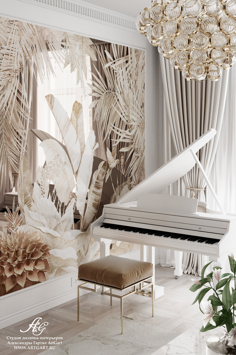 Интерьер лишенный всякой инфантильности для девочки #шкатулка_на_брюсове Главное украшение гостиной – белый рояль. Девочка с малых лет занимается музыкой. Можно не сразу заметить, но мы сделали специальный светильник, который будет направлен на ноты. При желании получится устраивать концерты в полумраке, будто бы на настоящей сцене. Рядом с роялем большое зеркало. Мы предлагали вариант зеркала с росписью, но клиенту показалось такое буйство растительности излишним. А какой вариант вам нравится больше? Изначально стены были толще, оказалось, что в них зашиты потолочные балки. Их было решено обыграть зеркалами. Удачным образом в них отражаются карнизы, и это буквально растворяет их в пространстве! Кое-где мы опустили потолок вровень с балками, а в них расположили коммуникации для системы кондиционирования. Две несущие колонны стали частью встроенного шкафа с витриной в центре. В центре комнаты прямой лиловый диван. Между двумя окнами стоит обеденный стол. Он раскладной. И четыре стула о