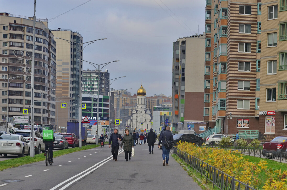 Что мы имеем? Четырехполосная дорога, правые полосы которой с обеих сторон наглухо заставлены припаркованными автомобилями; лежачие полицейские перед каждым пешеходным переходом (это хорошо), широкий тротуар с огороженным газоном и велодорожками (тоже неплохо, особенно с учетом того, что во дворах гулять особо негде: крохотные детские площадки, а все остальное большая бесконечная парковка). И над всем этим нависают многоэтажные новостройки, жители которых проводят полжизни в пробках - сначала в Петербурге, потом на въезде в город, а потом и в самом городе. Потому что их слишком много для таких узких дорог, а общественный транспорт не самая сильная сторона Кудрово, тем более что метро тут пока только обещают - не раньше 2029 года.
