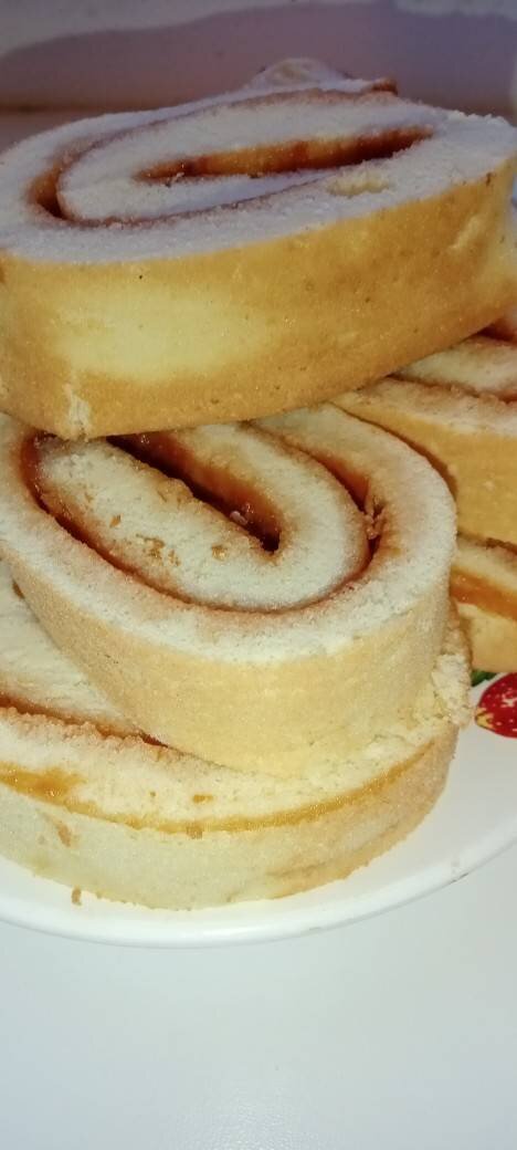 Ингредиенты: Яйца крупные , Сахар , Ваниль , Мука , Любое варенье или джем Способ приготовления: Разогрейте духовку до 190 градусов. Миксером взбейте яйца с сахаром и щепоткой соли в течение 10-15 минут, чтобы масса стала достаточно густой. Добавьте ваниль. Аккуратно добавьте порциями просеянную муку и медленно перемешайте тесто до однородности. Выложите тесто в форму или на противень, покрытый пергаментом или смазанный маслом. Распределите равномерным, относительно тонким слоем. Выпекайте 15-20 минут, не открывая духовку (поверхность готового бисквитного коржа должна быть светло-коричневой). Снимите бумагу и смажьте бисквит джемом (если джем слишком густой, можно его немного разогреть в кастрюльке). Обратной стороной ножа продавите полосу вдоль меньшей стороны бисквита (на расстоянии 1,5-2 см от края) и сверните бисквит рулетом. Приятного аппетита!
