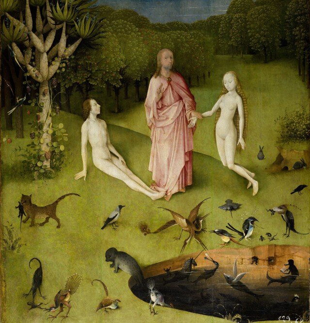 Создатель, взяв Еву за руку, как на обряде венчания, велит своим детям плодиться и размножаться — об этом недвусмысленно свидетельствуют кролики, во все времена считавшиеся символом плодовитости. Однако реагируют дети по-разному, что стало поводом для нескончаемых теологических дискуссий, которые веками ведут исследователи творчества Босха. Адам смотрит на Еву с восхищением и энтузиазмом. Ева же стыдливо потупилась, что, в самом деле, подозрительно. Если Ева еще не вкусила запретного плода, то не имеет понятия о таких категориях, как Добро и Зло. И, по идее, должна не ведать стыда. Выходит, концепция гендерного равноправия была Босху не близка — женщин он считал изначально пороком.