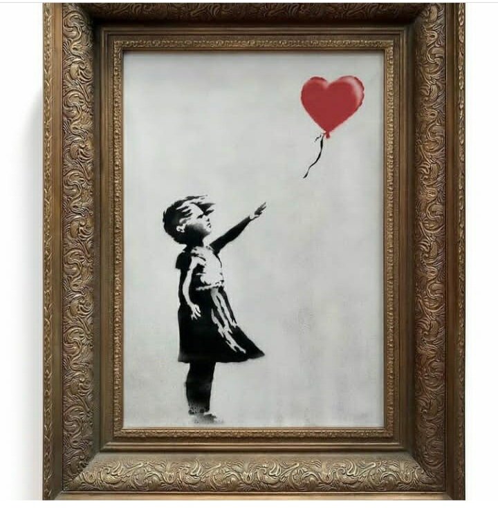 –Продано! За 1,04 миллиона фунтов стерлингов.— окончательный удар аукционного молотка. ⠀ "Девочка с красным шариком" с подписью "Всегда есть надежда"в широкой золотой раме. Самая известная работа анонимного художника. Создавалось это граффити в поддержку беженцев Сирии. (2002 год) ⠀ И, о боже! 😱Шедевр неизвестного художника, который известен всему миру. Исчезает на глазах изумлённой публики. ⠀ Такого ещё на площадках аукционов не видели. Только прозвучала окончательная цена и новый владелец картины начал радоваться выгодному приобретению. Включился встроенный в раму механизм шредера и картину порезало на мелкие полоски (не до конца) Ошеломлённое замешательство произошло у публики аукциона. Как это могло произойти? ⠀ Кто этот провокатор–художник? А может это и не его имя, а целого движения художников–нелегалов? ⠀ Бэнкси–самый известный преступник этого года или самый известный художник? Главное преступление Бэнкси совершает, когда напоминает обществу о морали.Что не должно быть войны.