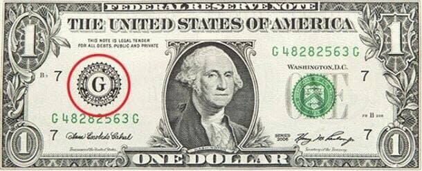 Эта буква — одна из многих обозначений банков Федерального Резерва, ответственных за печать купюр. В данном случае «G» означает Чикаго. Среди букв на американских купюрах бывают «А» (Бостон), «В» (Нью-Йорк), «С» (Филадельфия), «D» (Кливленд), «Е» (Ричмонд), «F» (Атланта), «Н» (Сент-Луис), «I» (Миннеаполис), «J» (Канзас-сити), «К» (Даллас) и «L» (Сан-Франциско).