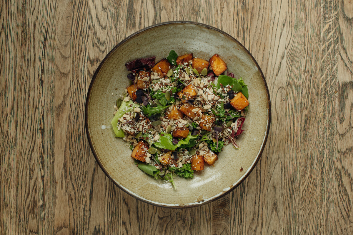 Автор: Алена Гера – концепт-шеф кафе деликатной кухни «Без рецепта», автор кулинарных книг. Ингредиенты: Тыква – 80 г Кокосовое масло для жарки – 20 мл Кленовый сироп – 20 мл Микс салата – 30 г Масло миндальное со вкусом апельсина (TRAWA oil) – 20 г Микрозелень (микс) – 2 г Микс семян и орехов: Семена кунжута – 4 г Орех кедровый – 5 г Семена кунжута белые б/масла – 5 г Семена тыквенные – 5 г Семена подсолнуха – 5 г Семена кунжута – 2 г Конопляные семена – 3 г Процесс приготовления: Легкий салат и простой в исполнении салат готов! Идеально в пост.
