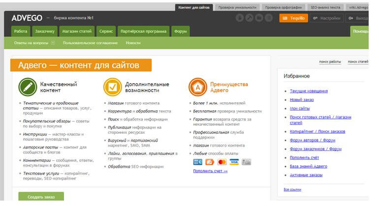 Advego - сайт для заработка в интернете без ДЕНЕЖНЫХ вложений. Вам предстоит пройти легкую регистрацию, а далее выполнять задания и зарабатывать деньги. Задания есть как и простые ( подписка/лайки в сот сетях ; отзывы и многое другое ) так и сложные ( написать статью и многое другое ). Простые задания может выполнить каждый и поэтому они МАЛООПЛАЧИВАЕМЫЕ - от 10 до 200 рублей., а вот задания посложнее может выполнить далеко не каждый и поэтому они хорошо оплачиваются - от 500 до 3-4тысяч и более. Так же на сайте можно продавать свои статьи или покупать чужие, так же можно проверить их на уникальность... Вывод денежных средств на сайте от 500рублей. На карты и электронные кошельки. В день можно заработать от 0 до 6-7т рублей