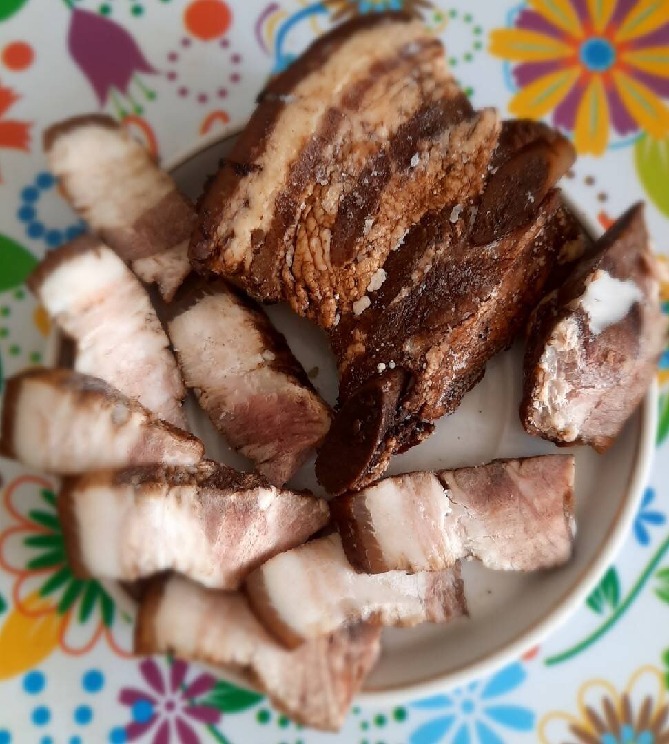 Из свиной грудинки получается шикарная мясная нарезка, которая вкуснее любой колбасы. Вариантов очень много, но и вкусы получаются разные. Сегодня будет оригинальный способ приготовления свиной грудинки в соевом соусе. Мясо получается очень вкусное и ароматное. Ингредиенты: свиной грудинки, соевого соуса, воды, Чеснок, сладкая паприка Способ приготовления: Кусок свиной грудинки с прослойками сала разрезать пополам. Залить соевым соусом, смешанным с водой. Если любите по-солонее, то используйте только 300 мл соевого соуса. Поставить на огонь, варить после закипания на медленном огне 45 минут. В процессе варки кусочки периодически переворачивать на разные стороны. Грудинка при варке приобретает темный красивый цвет, аромат прекрасный. Накрыть все тарелкой, поставить груз, охладить около 1 часа на столе и затем отправить в холодильник минимум на 3 часа (можно оставить и на ночь). Кусочки свиной грудинки вынуть и просушить бумажными полотенцами. Их можно сразу нарезать и подавать. А еще та