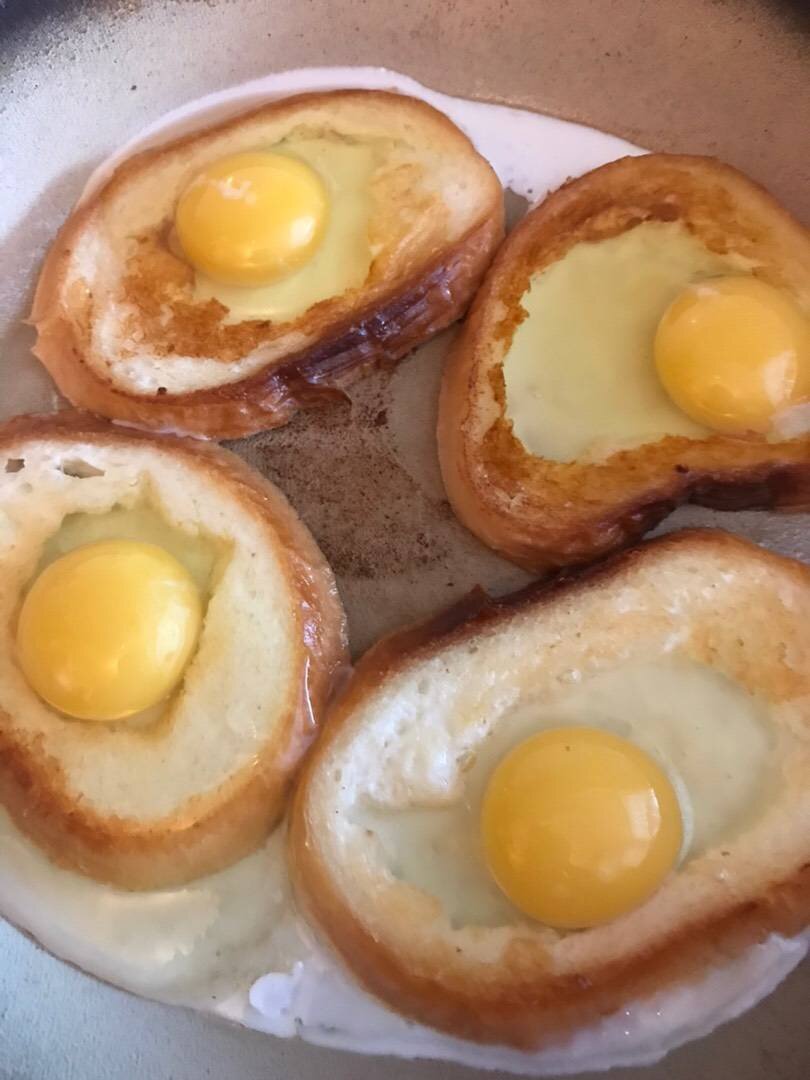 Ингредиенты: Хлеб, Яйца, Молоко, Соль, Сахар (не обязательно), Сливочное (растительное) масло для жарки Способ приготовления: Вынимаем серединку из хлеба. На порцию из 4 шт. В отдельную емкость наливаем молоко (100 мл), добавляем соль и кто любит сахар (1 ч.л). Перемешиваем. Обмакиваем хлеб с 2-х сторон, кладём на разогретую сковородку (можно жарить на сливочном или растительном масле). Когда хлеб обжарился с одной стороны, переворачиваем и сразу вбиваем яйцо. Закрываем крышкой и готовим на среднем или маленьком огне. Примерно 5-7 минут. Приятного аппетита! P.S. Чтобы мякиш не пропадал, можно в оставшуюся смесь с молоком добавить и взбить вилкой яйцо. Пожарить дополнительно просто хлеб с яйцом.