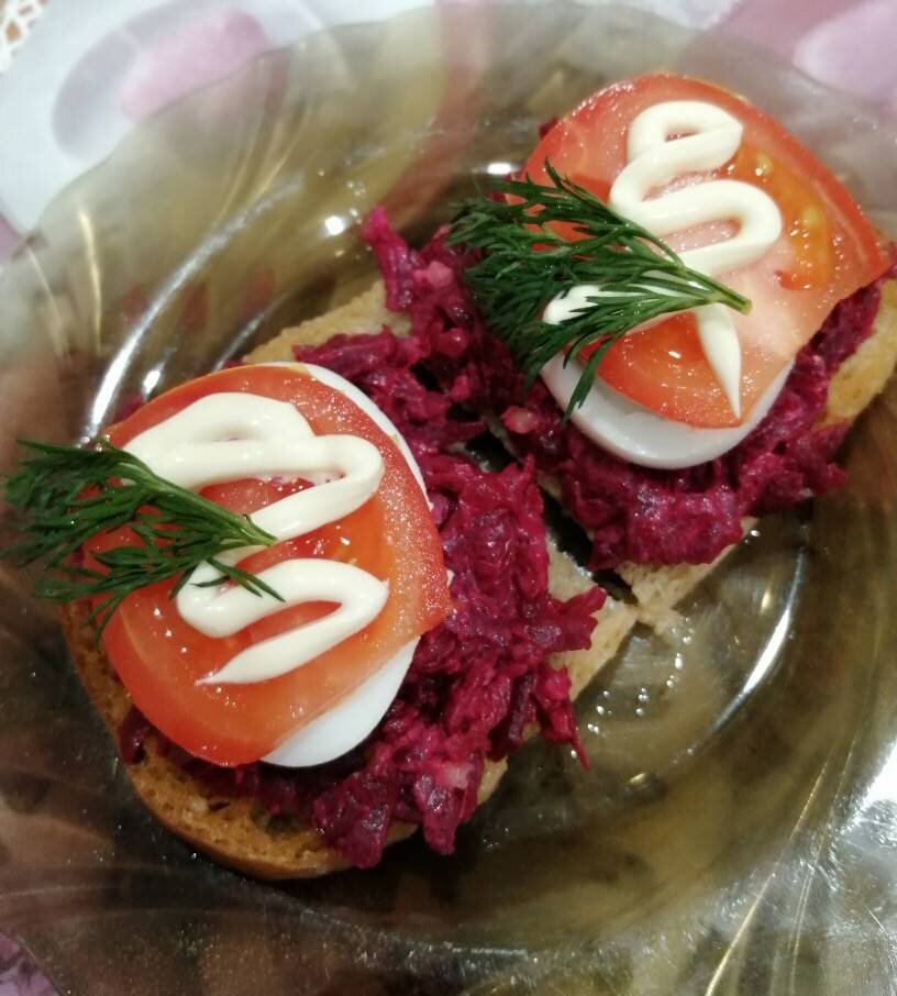#готовимвместе #свекла#закуска. Красивая и вкусная закуска порадует в любой день, и достойно будет занимать место на праздничном столе. Ингредиенты: свёкла, яйцо, помидор, чеснок, Грецкий орех, майонез, соль, чёрный молотый перец (по желанию), хлеб или батон, Сливочное масло для обжарки, зелень Способ приготовления: Свёклу отварить в не солёной воде 1,5 часа. Остудить, натереть на крупной терке. Чеснок пропустить через пресс,ядро грецкого ореха помыть, порубить мелко ножом, добавить к свекле.Заправить майонезом и по желанию солью и перцем. Все перемешать. Сварить яйцо, разрезать на четыре части. Помидор нарезать кругляшками. Масло растопить на сковороде, обжарить с обоих сторон кусочки хлеба. Следите, чтобы хлеб не подгорел. На хлеб намазать свёклу, затем положить яйцо, на яйцо положить помидор. Украсить майонезом и зеленью. Пальчики оближешь!