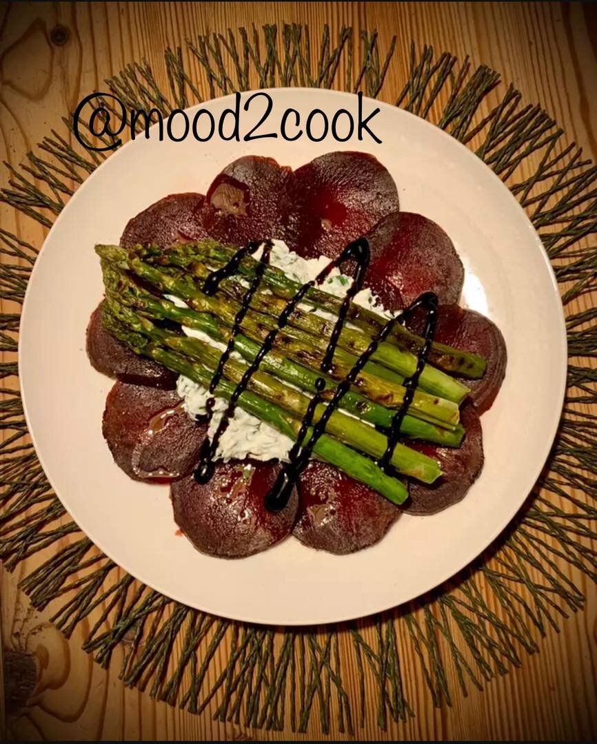 Сочетание свеклы и сыра всегда прекрасно! А если добавить ещё и спаржу с бальзамическим кремом, то получится очень изысканная закуска-стартер!!!! #готовимвместе #свекла Ингредиенты: Свекла (запечённая) , Зелёная спаржа , Сыр рикотта , Лук шалот, Петрушка, Оливковое масло , Бальзамический уксус , Сливочное масло , Кунжутные семена (либо бальзамический крем), Соль, перец Способ приготовления: Спаржу обжарить на гриле до готовности. Она должна размягчится, но, при этом хорошо держать форму. Лук шалот и петрушку мелко нарубить, смешать с рикоттой и приправить по вкусу. Нарезать кружочками свёклу и выложить на блюдо. Приправить и сбрызнуть оливковым маслом и бальзамическим уксусом. Выложить наверх сыр и готовую, ещё тёплую спаржу. Посыпать семенами кунжута (или полить бальзамическим кремом).