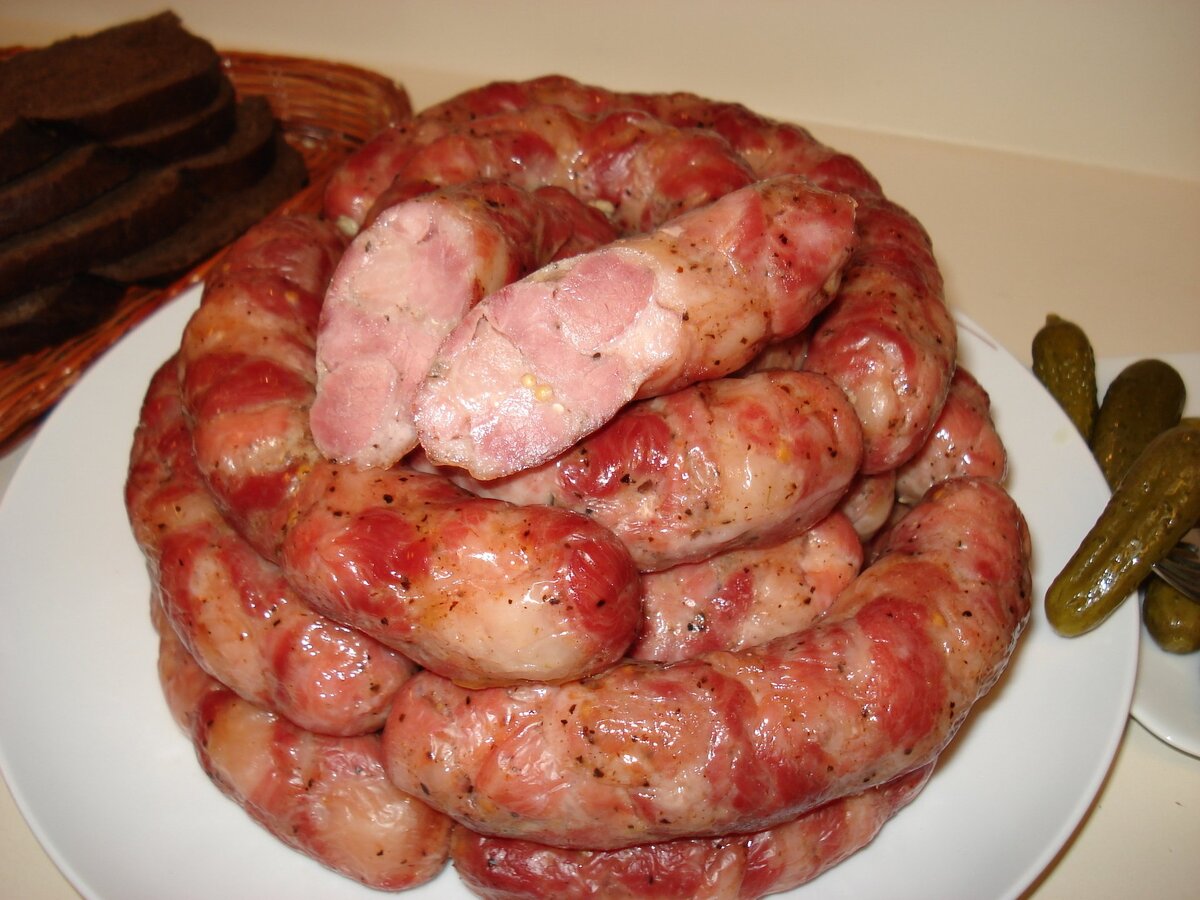 Украинская домашняя колбаса. Мясо измельчают на кусочки по 15-20 г. и смешивают с солью (2,5% к массе мяса) и специями ,после набивают кишки. Перевязанную шпагатом колбасу в подвешенном состоянии просушивают 30-50 мин.,проколов оболочку иглой в нескольких местах.Колбасу можно варить,жарить,запекать. Колбаса с луком. Изрубить в мясорубка 2 1/2 фунта свинины, 1 фунт говядины, по 1/4 фунта лука,поджаренного в масле, и сырого, 3 зубчиками чеснока истертого на терке, 2 лота соли,1/2 лота селитры, 3/4 лота перца,прибавить свиного сала,изрубленного на мелкие кусочки, все хорошо перемешать и начинить свеные кишки,повесить на три дня на ветру, затем 2-3 недели коптить. Кровяная колбаса. Собрать свежую свиную кровь,размещать деревянной ложкой,посолить и поставить в холодное место. Взять обрезки мяса из шеи и других мест(на кило крови 1,5 кг. обрезков) ,нарезать вместе с жиром,прибавить соль, чёрный перец,тмин, душистый Перез ,гвоздику и перемешать с кровью.Наполнить кишки полученной смесью ,зав