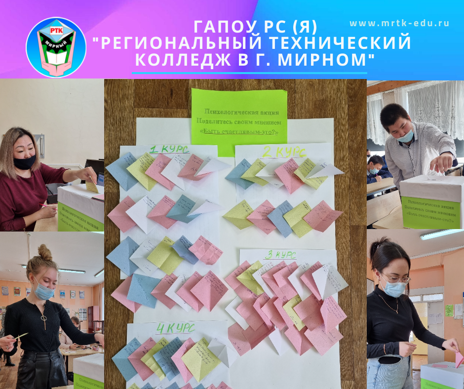 Психологическая акция в МРТК: поделитесь своим мнением «Быть счастливым - это?» . 7 и 8 апреля 2022 г. в ГАПОУ РС (Я) «Региональный технический колледж в г. Мирном» в рамках Месячника психологического здоровья обучающихся для студентов колледжа прошла акция «Быть счастливым - это?». С самых давних времен людей волновал вопрос что значит быть счастливым. Термин "счастье" является сложным психо-социальным явлением, но и тем, что он может приобретать разные смыслы. Каждый человек воспринимает счастье по-своему (для кого-то это могут быть знания, деньги или что-то одно в соединении с удовольствиями). На переменах, студентам колледжа был задан вопрос, что для них значит быть счастливым. Свое мнение по данному вопросу каждый студент записывал на стикере, а затем опускал его в заранее подготовленный ящик. Указывали только курс, на котором они обучаются. По итогу акции все стикеры были размещены на стенде, расположенном на первом этаже колледжа. Счастье, как и мечта - это некий идеал, к кото