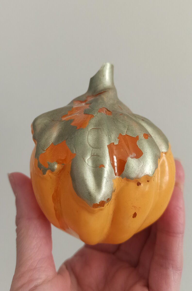 Вы, наверно, заметили, что в последнее время я увлеклась фруктово-овощной темой. Все ходовые позиции я уже собрала, теперь ищу себе редкости. Вот, например, тыква от Культигрушки. Редкая и не дешёвая игрушка обычно. В хорошем состоянии может стоить порядка 1000 рублей и выше. В амальгаме так вообще редкость редкостная. Амальгамную я пока себе не нашла, зато поймала облезлую в краске. Вот такая тыковка попала ко мне в руки. Скол трубочки и облупление краски. Состояние на вид никакое, но можно привести в порядок, что я и сделала. Смыла старую краску, нарастила трубочку с помощью эпоксидки. Окраску оранжевым цветом я делала с помощью аэрографа. Про аэрограф я рассказывала тут. Первый слой и подбор цвета. Этот красивый, но слишком яркий. Дальше методом замешивания и экспериментирования ищу нужный мне цвет. Останавливаюсь на наиболее похожем. Далее сушка. И остаётся листик. Его крашу вручную кистью с использованием красок Тамия. Сушка и готова моя тыковка. Надеваю подвес. Для интер