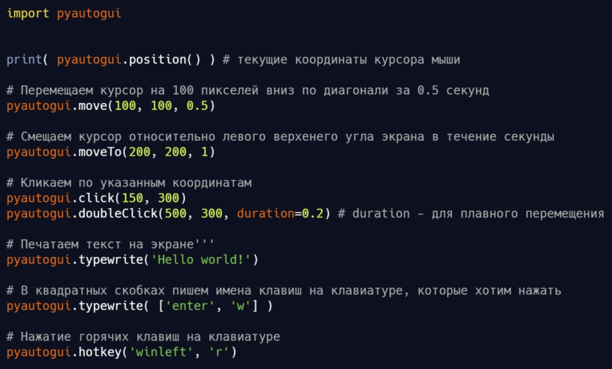 Pyautogui ΠΡΠ΅Π½Ρ ΠΈΠ½ΡΠ΅ΡΠ΅ΡΠ½Π°Ρ ΠΏΠΎ ΡΠ²ΠΎΠΈΠΌ Π²ΠΎΠ·ΠΌΠΎΠΆΠ½ΠΎΡΡΡΠΌ Π±ΠΈΠ±Π»ΠΈΠΎΡΠ΅ΠΊΠ°. ΠΠ½Π° ΠΏΠΎΠ·Π²ΠΎΠ»ΡΠ΅Ρ ΠΌΠ°Π½ΠΈΠΏΡΠ»ΠΈΡΠΎΠ²Π°ΡΡ ΡΠΊΠ°Π·Π°ΡΠ΅Π»Π΅ΠΌ (ΠΌΡΡΠΊΠΎΠΉ) ΠΈ ΠΊΠ»Π°Π²ΠΈΠ°ΡΡΡΠΎΠΉ ΠΏΡΡΠΌΠΎ ΠΈΠ· ΠΊΠΎΠ΄Π°. Π‘ΡΠΎΠ»ΡΠΊΠΎ Π²ΡΠ΅Π³ΠΎ ΠΈΠ½ΡΠ΅ΡΠ΅ΡΠ½ΠΎΠ³ΠΎ ΠΌΠΎΠΆΠ½ΠΎ ΠΏΡΠΈΠ΄ΡΠΌΠ°ΡΡ Ρ Π΄Π°Π½Π½ΠΎΠΉ Π±ΠΈΠ±Π»ΠΈΠΎΡΠ΅ΠΊΠΎΠΉ. ΠΠΎΠΆΠ½ΠΎ Π½Π°ΠΏΠΈΡΠ°ΡΡ ΠΏΡΠΎΡΡΠ΅ΠΉΡΠΈΠΉ ΠΊΠ»ΠΈΠΊΠ΅Ρ ΠΈ "ΡΠ°ΡΠΌΠΈΡΡ" Π±ΡΡΡΡΠ΅Π΅ Π΄ΡΡΠ³ΠΈΡ