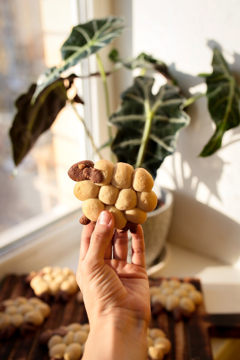 Этот рецепт был давно у меня в сохранённых, и тут оказалось, что это не простое печенье, а пасхальное) Дети были в восторге от него😍 Ингредиенты: - мука 200 гр - слив. масло 100 гр - яйцо 1 шт. - сахарная пудра 100 гр - соль щепотка - разрыхлитель 1/2 ч.л. - ванильный сахар 1 ч.л. - какао 1 ч.л. Смешать размягченное сливочное масло с сахарной пудрой и ванильным сахаром. Добавляем яйцо и соль, перемешиваем. Добавляем разрыхлитель и половину муки, перемешиваем. И оставшуюся часть. По необходимости, если слишком липнет, можно добавить ещё муки. Небольшой кусочек теста отщипнуть и смешать с какао. Положить тесто в 2 разных пакета и убрать в холодильник на 30 мин. Скатать колбаску из белого теста. Поделить на части. Из каждой скатать шарик. Сформировать барашка, как на фото. Тело барашка состоит из 3-х рядов. В среднем ряду 4 шарика, сверху и снизу по 3. Добавляем голову, ушки и ножки из шоколадного теста. Выпекаем в предварительно разогретой до 180 гр духовке в течение 15 мин. Прия