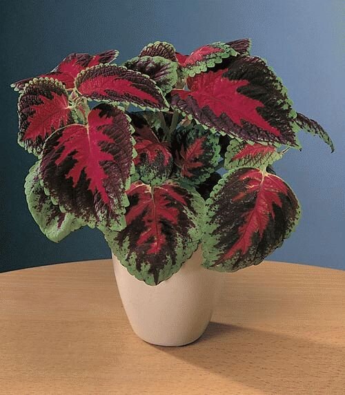 Это очень эффектное декоративное растение, которое имеет яркие красно-коричневые листки, обрамленные зеленой каемкой. Ухаживать за колеусом не сложно: растение предпочитает солнечные места, нуждается в умеренном поливе и просто обожает прищипывание (стрижку).