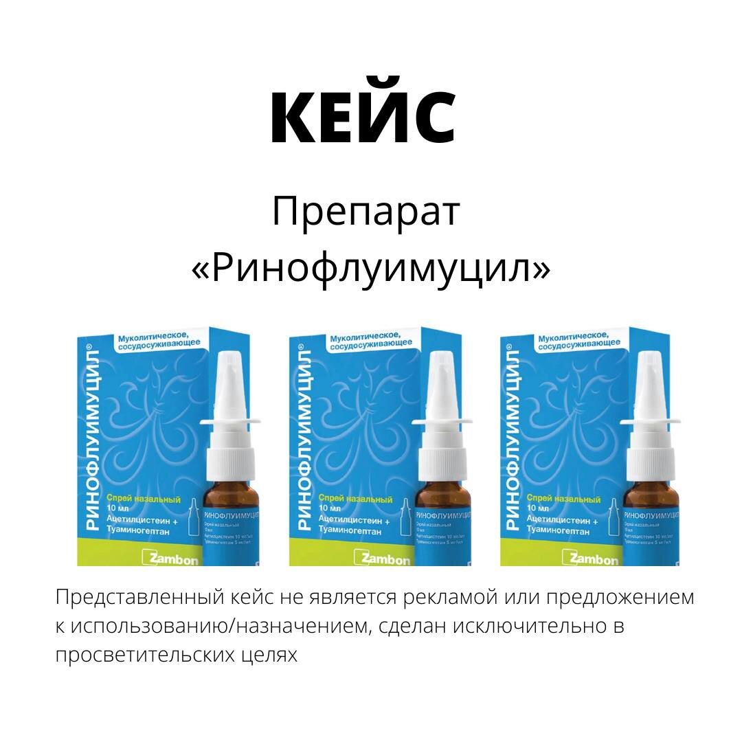 Неделю назад я приболела и сидела под одеялом, периодически выныривая посмотреть на свет и вливая в себя все, чтобы стало легче 🤒. Один из таких «все, чтобы стало легче» был «Ринофлуимуцил». Я сделала этот кейс не для того, чтобы посоветовать препарат или поделиться впечатлениями от использования. Мне интересна другая точка зрения на препараты - история разработки препарата, инновации, которые в них заложены, и стратегия интеллектуальной собственности, которую используют компании для защиты своих разработок и продуктов 👩💻. Итак, представляю вам кейс по препарату «Ринофлуимуцил» 💼 О препарате Спрей назальный «Ринофлуимуцил» зарегистрирован в РФ как лекарственное средство с 2007 года. В качестве активных веществ – комбинация из Ацетилцистеина и Туаминогептана. Ацетилцистеин – муколитик, то есть имеет разжижающее действие, разрушает связи в гликопротеинах слизи. Туаминогептан – оказывает местное сосудосуживающее действие без воздействий на сосуды организма в общем. В комбин