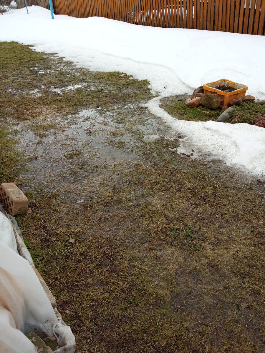 Ну что, дождались весны? Вчера у нас в Костроме после почти двухнедельного ежедневного снегопаданья вдруг резко повысилась температура. Аж до +14 днём. При этом солнца нет, пасмурно и вдобавок ко всему почти сутки шёл дождь. И что же я вижу, приехав домой? Почти весь снег, которого были реально горы, бесследно испарился всего за 48 часов. И меня это не радует. Спросите почему? Потому что резкое таяние снега ничего хорошего для садовода не представляет. Во первых, всё стоит в воде. А это не полезно ни для каких растений. Конечно, кратковременное затопление не сильно страшно, но если ночью подморозит - а это вполне реально, то растения будут вмерзать в лед. А вот это уже критичные повреждения. У меня на участке по всему периметру сделана водоотводящая система. Вся вода собирается в более низких местах, и из этих мест уже по трубам, которые находятся в земле, стекает в колодцы. Колодцев у нас ровно пять штук, они проходят линейно посередине участка. Низкие места были выявлены экспер