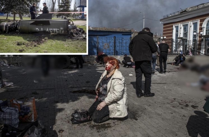 «Россию обвинили в "зле без границ" после того, как баллистическая ракета со словами "Для детей", нарисованными на ее стороне, вчера попала на переполненный железнодорожный вокзал, когда матери, дети и пожилые люди пытались бежать на восток Украины.