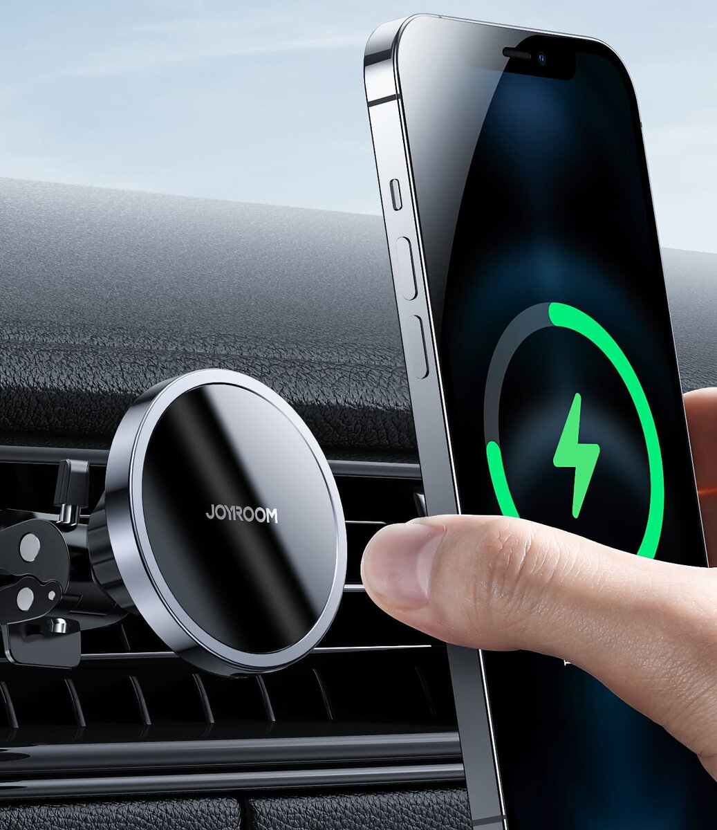 Беспроводная автомобильная зарядка очень выручает, когда на смартфоне запущен навигатор. В таком случае удается избежать моментального расхода батареи. На AliExpress огромное количество автомобильных зарядок разного типа. Но Joyroom является самой удобной из них, потому что поддерживает MagSafe. Зарядка выполнена в виде обычного автомобильного держателя для дефлектора. iPhone 12 и 13 крепятся к нему с помощью MagSafe, поэтому никакие магниты на корпус смартфона или чехол клеить не нужно. В комплекте есть специальные магнитные стикеры, которые можно приклеить на любой смартфон, например, на iPhone без MagSafe. Они не блокируют беспроводную зарядку. Я сам пользуюсь подобным держателем с MagSafe. Магниты действительно надежно держат iPhone 12. Смартфон ни разу не выпадал на неровных дорогах, резком торможении и при проезде жестких лежачих полицейских. Внутри Joyroom установлена беспроводная зарядка на 15 Вт. Но iPhone сможет заряжаться только с мощностью 5 Вт. Этого будет достаточно для