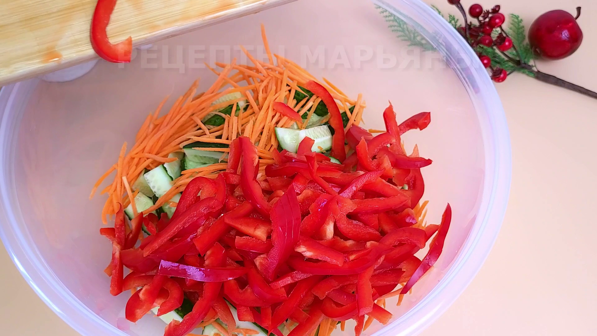 Здравствуйте, дорогие гости и любимые подписчики! Я очень рада, что вы заинтересовались этой статьей. Приглашаю подписаться на мой канал "Рецепты Марьяны", чтобы первыми увидеть новые интересные рецепты и удивлять ими родных. Сегодня я готовила вкусный салат из свежих овощей без майонеза. Вообще такой салат можно приготовить практически из всего, что есть в холодильнике. Получается он пикантный и очень вкусный, остроту можно регулировать по своему вкусу. Такой салат можно взять на пикник, а также не стыдно подать гостям. Смотрите ВИДЕО этого рецепта: Приготовление Огурцы нарезать треугольными ломтиками, морковь натереть на корейской терке, болгарский перец нарезать соломкой. У помидоров срезать мякоть (в салате она не понадобится) и нарезать также соломкой. Чеснок, зеленый лук, укроп и кинзу мелко измельчить. Смешать все ингредиенты в большой чаше. Добавить соль, паприку, соевый соус, уксус и перец по вкусу (можно сделать салат острым, я добавила черного перца совсем чуть-чуть, та