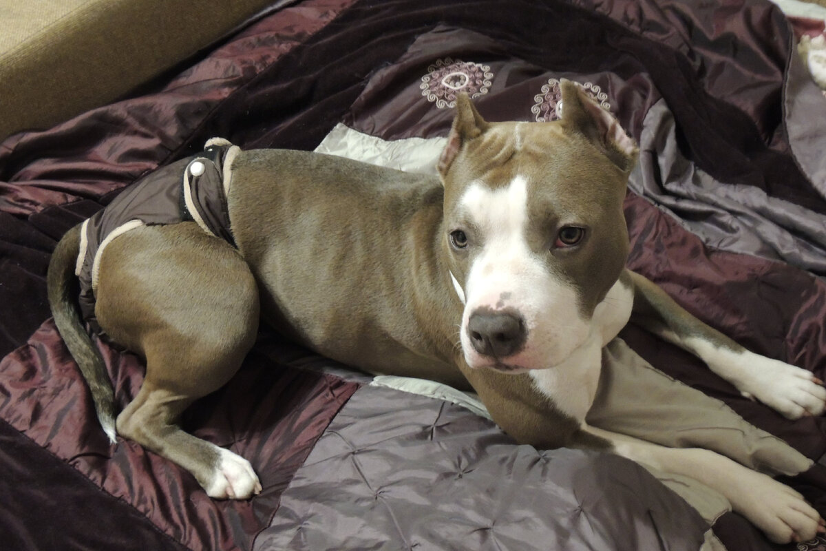 А вы знали что есть подгузники для собак? Я раньше не знала... Оказывается, во время течки собакам покупают специальные трусы, при чём они могут быть одноразовые и многоразовые. Мы ребята экономные, поэтому решили купить многоразовые труселя, естественно они ей жутко не нравятся (может она хотела другого цвета? 😁) Так вот, трусы эти на липучках (что ей, наоборот, нравится 😁) , сдирает с себя их в "мгновение ока". Поэтому пришлось сделать кнопки, так их снять гораздо сложнее:) Так что если будете покупать такие трусы для своей собаки, подумайте о застежке, не повторяйте наших ошибок, ну или потом придётся заниматься "рукоделием":) В трусах нашей стаффочке придётся ходить не мало времени(около двух недель), так что Няша, мы терпим(период течки у собак не назовёшь спокойным) и ты потерпи:)