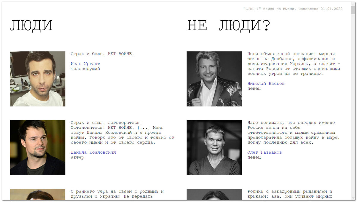 «Зашёл на сайт «люди/не люди». Меня мало волнует, что нас (ряд справа) либеральные активисты расчеловечивают, а людей из ряда слева 👈 пресс-секретарь президента и главнокомандующего именует заблудшими патриотами. Меня другое волнует: если вы зайдёте на сайт, вы увидите, что ряд слева - он в пять раз длиннее.