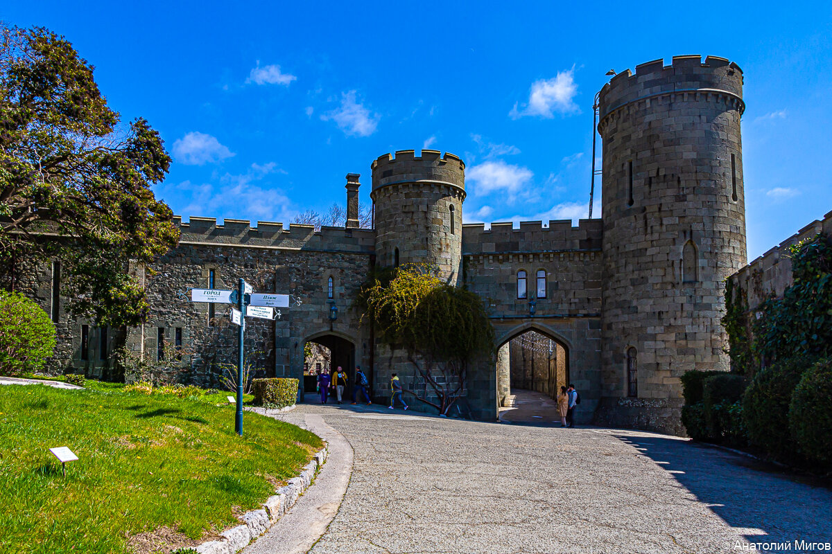 Давно собирался побывать в Алупке. Много слышал про удивительный Воронцовский дворец и замечательный парк. И вот, случилось. Сегодня расскажу, каким я увидел дворец. А про парк, который произвел на меня не менее мощное впечатление, напишу отдельно. Про свое первое впечатление скажу словами Лены: - Альгамбра отдыхает! В дворцовом комплексе испанских эмиров - Альгамбре - мы с Леной были в далеком 1995 г. Кстати, это была наша первая поездка в Европу. Нам понравилось. Гармония рукотворного камня, воды и цветов. До сих пор, если надо оценить нечто подобное восхитительное, мы сравниваем это в Альгамброй. Но тут, действительно, даже лучше Альгамбры. Может быть это еще и потому, что здесь море и много простора. Кстати, потом я уже узнал, что архитектор Воронцовского дворца черпал вдохновение именно в Альгамбре, так что сравнение возникло не на пустом месте. Еще о сравнениях и ассоциациях. Едва я увидел круглые башни дворца, как на ум пришла старая добрая Англия сентиментальных романов. Айвен