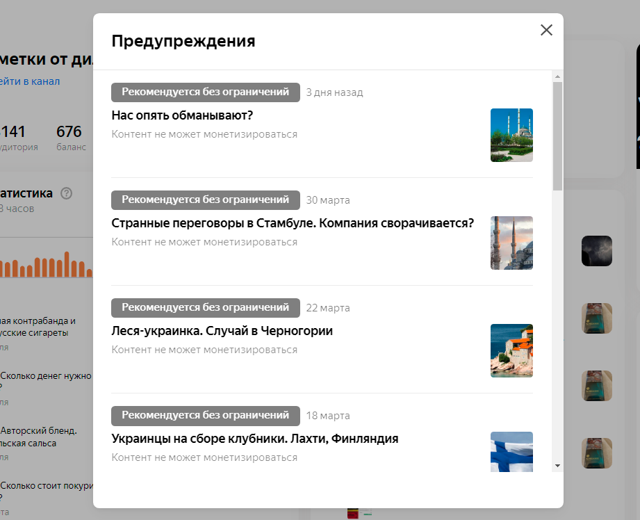 Доброго времени суток, уважаемые читатели канала! И снова с вами я. И опять мной заинтересовались. Как в песне "утром в интернете, вечером в следственном комитете". Кину скриншот: И это еще не всё. Это только последние статьи на канале. Статьи рекомендуются без ограничений (в ленте для всех, не только для подписчиков канала) но рекламы в них нет. И за это не начисляются деньги. Я уже пару раз объяснял про деньги-монетизацию на канале. Канал табачной направленности, популярность есть но в довольно узком сегменте. Его читают, советуются, выражают свое мнение в комментариях. Но денег я с него не вижу, почти. И давным-давно понял что это не место где можно заработать на хлеб. Но... Я к нему (каналу) отношусь как к своему детищу, как к собаке-инвалиду. Которую нельзя выбросить на улицу потому что это верный друг. А мы своих не предаем... Иногда я пишу о вещах которые меня как-то задели или волнуют. Вот эти статьи и попали под ограничение. В них просто нет рекламы но они не нарушают требова