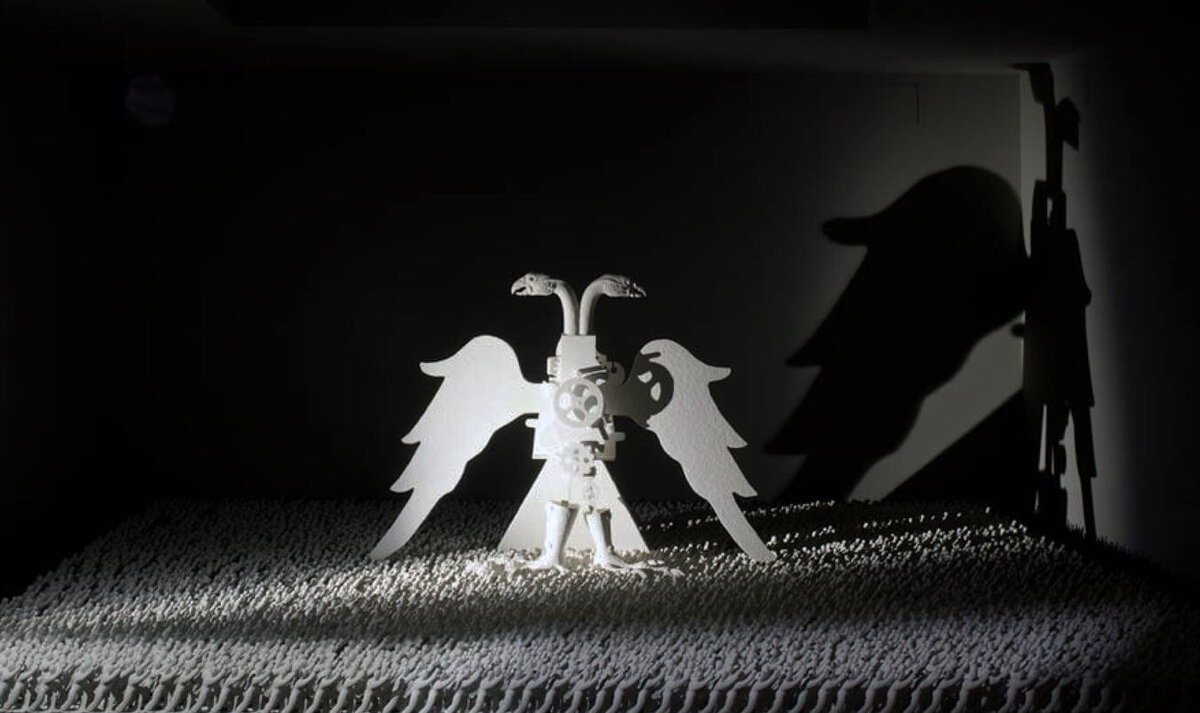 В девяти залах Новой Третьяковки развернулась захватывающая история бытования и изменения культурных и исторических мифов, рассказанная Гришей Брускиным. Наконец-то кураторам московского музея удалось уйти от концепции выставки-биографии и создать проект, полностью сконцентрированный на одной важной идее: смене исторической декорации. В настоящей ситуации очень смелое решение для государственного музея. Выставку открывает Всадник (2019) на своем многоногом коне, чьи копыта подобно героям футуристических картин бесконечно множатся в пространстве, и абсолютно завораживающей видеоинсталляцией, где в медетативной форме рассказан миф истории сотворения мира. За счет приглушенного света и буквально шаманской музыки полное погружение происходит сразу. Язык скульптур Брускина очень запоминающийся и узнаваемый. Он работает со слегка огрубленной, бруталистской эстетикой. Странным образом ставшие родными герои советской действительности: солдаты, космонавты и пионеры предстают перед зрителями