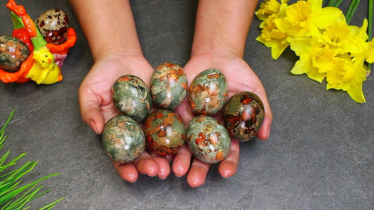 Сегодня я хочу поделиться с вами оригинальным способом покраски яиц на Пасху. А в качестве красителей буду использовать только натуральные компоненты, такие как луковая шелуха и чай каркаде. Я красила яйца этим способом впервые и даже не ожидала, что может получиться такая красота! Взгляните, какие фантастические, мраморные яйца у меня получились и это при использовании простых натуральных красителей! Всё, что необходимо и видео инструкцию вы можете увидеть в конце статьи ⤵️⤵️⤵️ Но, к огромному сожалению, радовалась я не долго, я даже и не подозревала, что меня ожидает впереди:)) Давайте-ка покажу и расскажу всё по порядку: прежде, чем приступить к окрашиванию яиц, их необходимо достать из холодильника, не менее чем за час, чтобы они не были холодными. А промытую и просушенную луковую шелуху нарезать, как можно мельче. Далее беру яйцо, смачиваю его в простой воде комнатной температуры и затем обваливаю его в луковой шелухе. Выкладываю яйцо на марлю или капрон. Плотно стягиваю края м