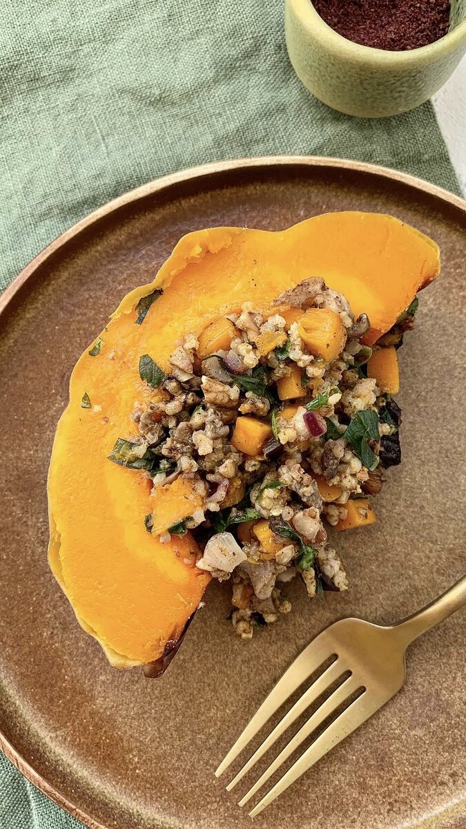 3. Фарш для тыквы из пшена, грибов, сухофруктов, запечённой тыквы, зелени и орехов - отдельное уникальное блюдо.