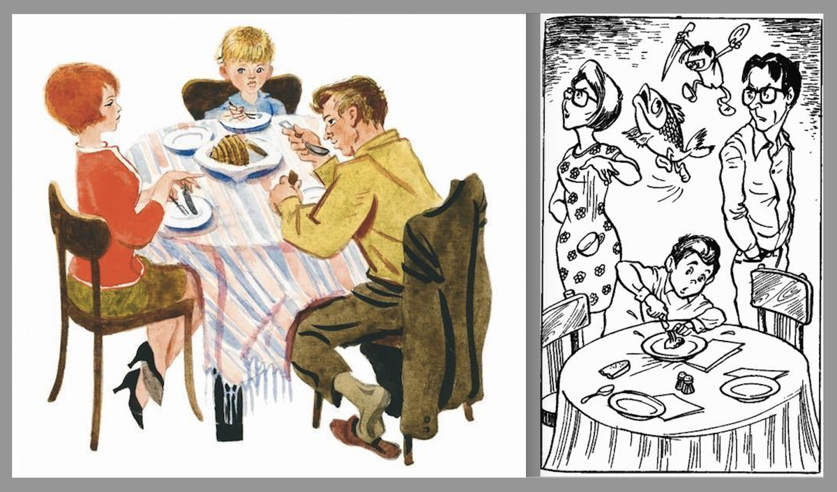 – Не роняй вилку на пол, – сказала мама. – А если уронил, сиди спокойно, не становись на четвереньки, не ныряй под стол и не ползай там полчаса. Не барабань пальцами по столу, не свисти, не пой! Не хохочи за столом! Не ешь рыбу ножом, тем более если ты в гостях.