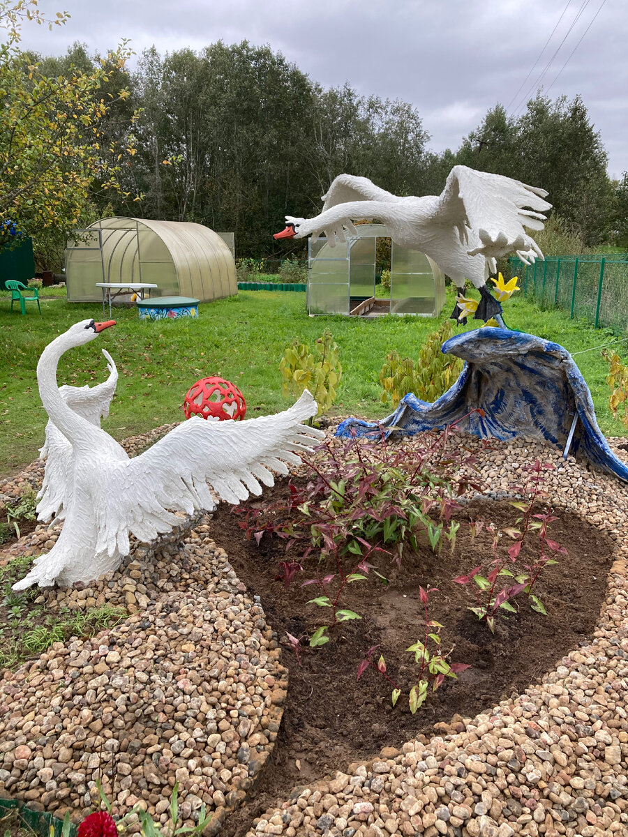 В прошлом году на даче,зашла к нам соседка.Она по весне,каждый год,дарит нам цветы-многолетники для клумб.А так как приехав на дачу,у меня была мысль сотворить что либо необычное,я была в поиске сложившегося образа будущего творения.Так вот,соседка,в очередной раз принесла нам растения и стала распрашивать,чем я в этом году займусь,что буду лепить?Девушка она у нас бесподобная.Всё при ней,и доброта,и мягкий характер,и интересный собеседник,и образование(юрист),и работает в приличной бр.компании,но до сих пор не устроена в личной жизни.Думаю,что из-за излишне сильной привязанности к своей маме и семье брата.А может просто пока не встретила своё счастье.Так хочется,чтобы она встретила свою любовь!Так вот,она стала распрашивать о планах по поводу моего будущего развлечения-лепки,прошла по участку,развернулась к нам спиной и со словами-"Слепи что нибудь такое!",вскинула руки!И в доли секунд у меня сложилась вся картина моей будущей композиции-Встреча двух влюблёных!Вот такой у меня был,на