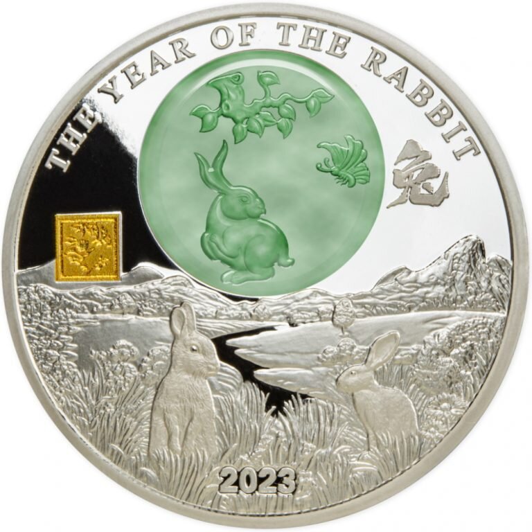 Этот денежный знак выходит в серии “Китайский лунный год”. Люди, рожденные в год Кролика, нежны и доступны. У них порядочные, благородные и элегантные манеры. На монете изображены два милых кролика с 24-каратным золотым покрытием и глянцевая пресноводная жемчужина естественного белого цвета! Согласно китайскому гороскопу, кролик — это ручное существо, олицетворяющее надежду и жизнь на долгое время. Это нежно и мило. У богини луны Чанъэ в китайской легенде есть кролик в качестве домашнего питомца, что наводит на мысль, что только это существо достаточно любезно, чтобы соответствовать ее благородной красоте. Другой способ сказать, что Кролик является воплощением богини Луны как таковой и всегда является символом чистоты и благоприятности. Технические характеристики монеты: