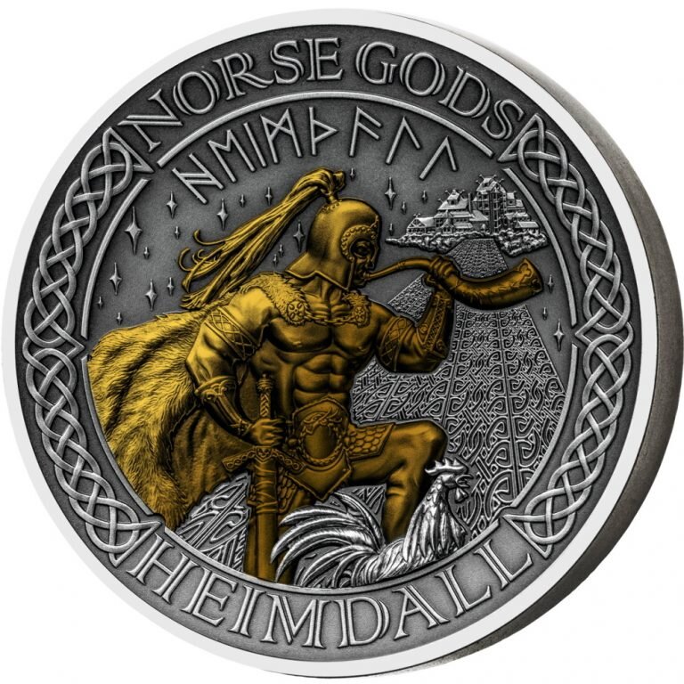 Этот денежный знак выходит в серии “Скандинавские боги”. Хеймдалль – в германо-скандинавской мифологии бог из рода асов, страж богов и мирового древа, считается сыном Одина и девяти матерей. «Светлейший из асов», «предвидящий будущее подобно ванам»; его прозвища — «златорогий» и «златозубый». Его дом — Химинбьёрг («небесные горы»), согласно «Младшей Эдде» располагается вблизи моста Биврёст, соединяющего небо с землёй. Как страж богов он охраняет Биврёст на границе Асгарда и Мидгарда от великанов-ётунов. Отличается острым зрением и слухом. Ему принадлежит лошадь с золотой гривой — Гулльтоп («Золотая чёлка»). У его пояса висит золотой рог — Гьяллархорн. Перед концом мира трубит в рог, призывая богов к последней битве. Во время Рагнарёка Хеймдалль и Локи убьют друг друга в схватке. Хеймдалль, также известный как Хеймдалль, почитается в скандинавской мифологии как одно из самых надежных и заслуживающих доверия божеств. Считалось, что он стоит на страже у входа в Асгард, защищая царство ска